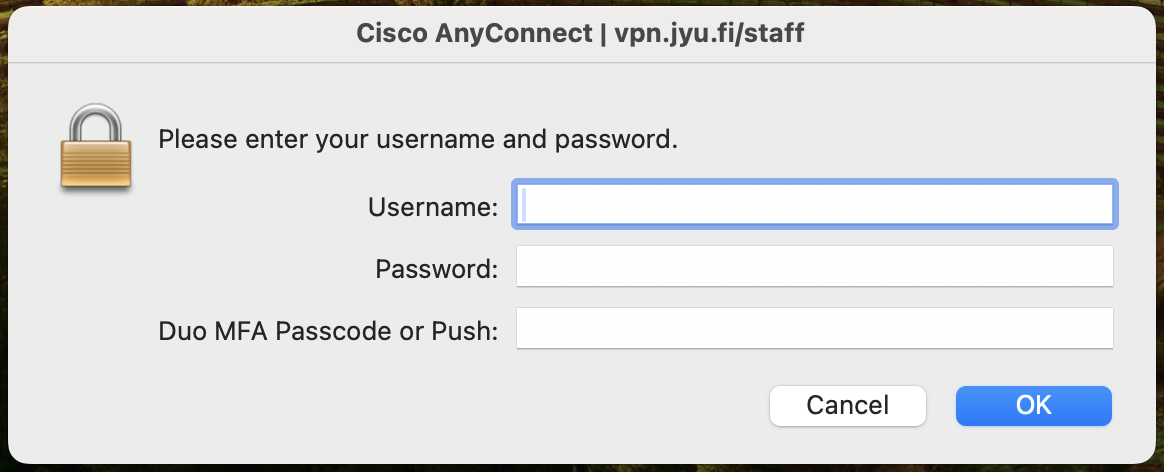 Lataa ja asenna Cisco AnyConnect-ohjelma alla olevasta linkistä kirjautumalla Jyväskylän yliopiston käyttäjätunnuksella, yliopiston salasanalla sekä kirjoittamalla toiseen salasanakenttään joko push tai 6-numeroinen DUO Mobile passcode.