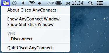 Kun lopetat työskentelyn, muista katkaista VPN-yhteys klikkaamalla yläpalkista "Disconnect".