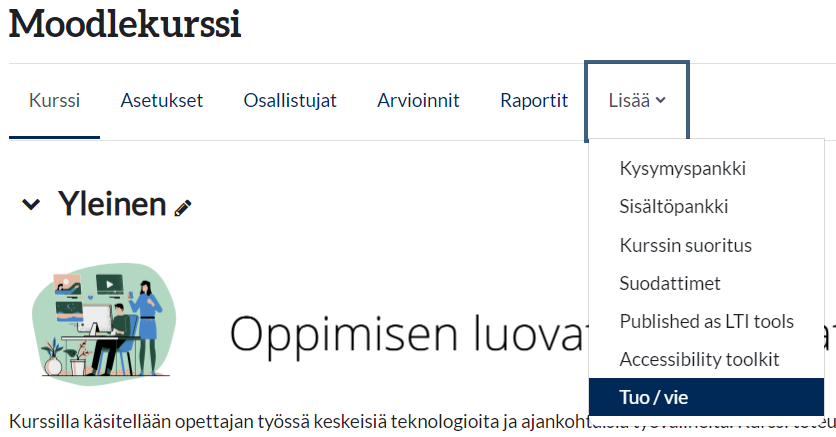 - Valitse seuraavaksi kurssi otsikon alta olevista välilehdistä Lisää ja valitse aukenevasta alasvetovalikosta Tuo/vie (englanniksi Course reuse).
