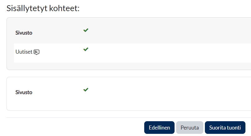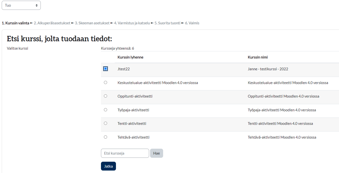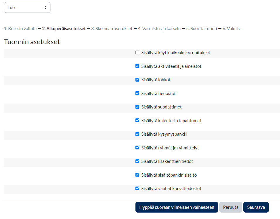 - Seuraavaksi voit valita, mitä haluat tuoda valitsemaltasi kurssilta. Jos haluat tuoda koko kurssin sisällön, voit valita suoraan "Hyppää suoraan viimeiseen vaiheeseen", jolloin kurssin sisältö kopioidaan suoraan uudelle kurssille. Jos haluat tuoda yksittäisiä aktiviteetteja ja aineistoja, valitse haluamasi sisältö ja valitse Seuraava.