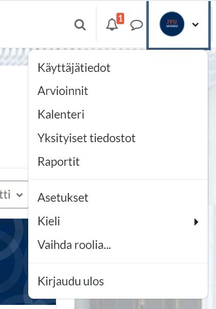 Profiiliasetuksiin eli Moodlessa oleviin käyttäjätietoihisi pääset Moodlen oikeassa yläkulmassa olevasta Profiili-kuvakkeesta klikkaamalla ja valitsemalla Käyttäjätiedot. Nämä samat ohjeet koskevat myös JYU Online courses -ympäristöä.
