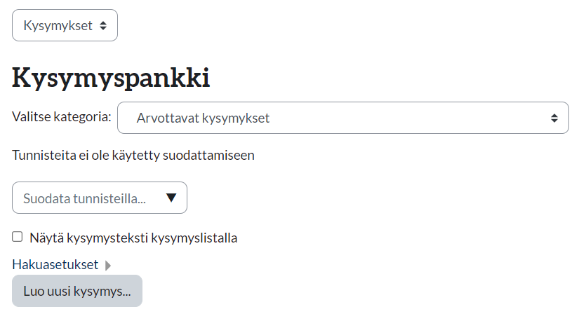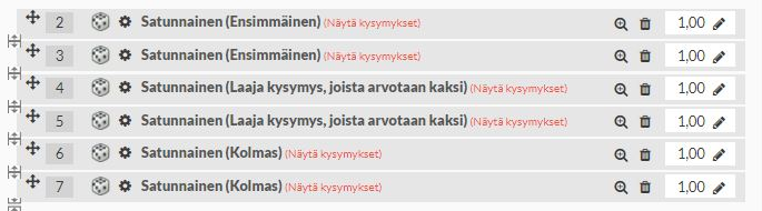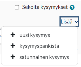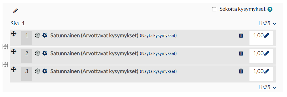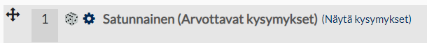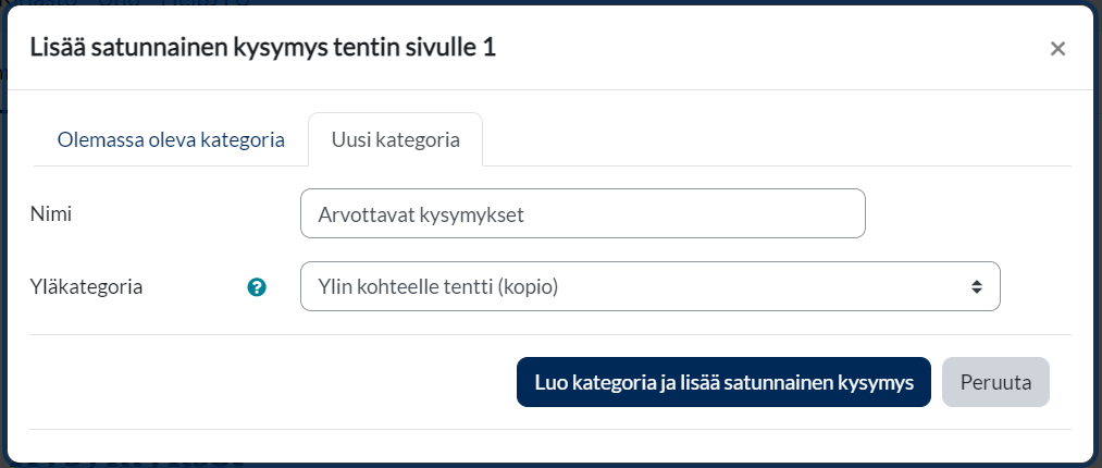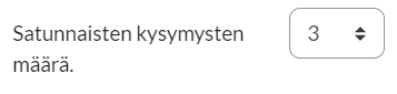 Voit lisätä ns. satunnaisia kysymyksiä, jolloin Moodle arpoo valitusta kysymyskategoriasta kysymyksiä opiskelijalle. Satunnaisten, arvottavien kysymysten tulisi olla keskenään samanarvoisia, jotta jokainen opiskelija saa "yhtä vaikeat" kysymykset. Voit arpoa kysymyksiä myös useasta eri kategoriasta, esimerkiksi 2 kysymystä kategoriasta "Aihe X" ja 2 kysymystä kategoriasta "Aihe Z". (Lähde: https://docs.moodle.org/3x/fi/Tentin_asetukset)