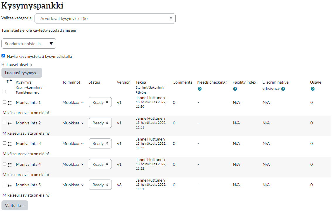 Näytä kysymykset -painikkeesta kysymyksen lopussa voit luoda kategoriaan kysymyksiä sekä lukea tai muokata tiettyyn kategoriaan lisätyt kysymykset.