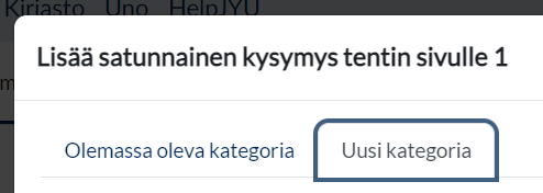 Ensin määrittelet kunkin kategorian kohdalla, kuinka monta kysymystä haluat. Sitten luot uusia kategorioita: Kirjoita "Satunnainen kysymys uudesta kategoriasta" -kohtaan kategorialle nimi ja klikkaa Luo kategoria ja lisää satunnainen kysymys -painiketta.