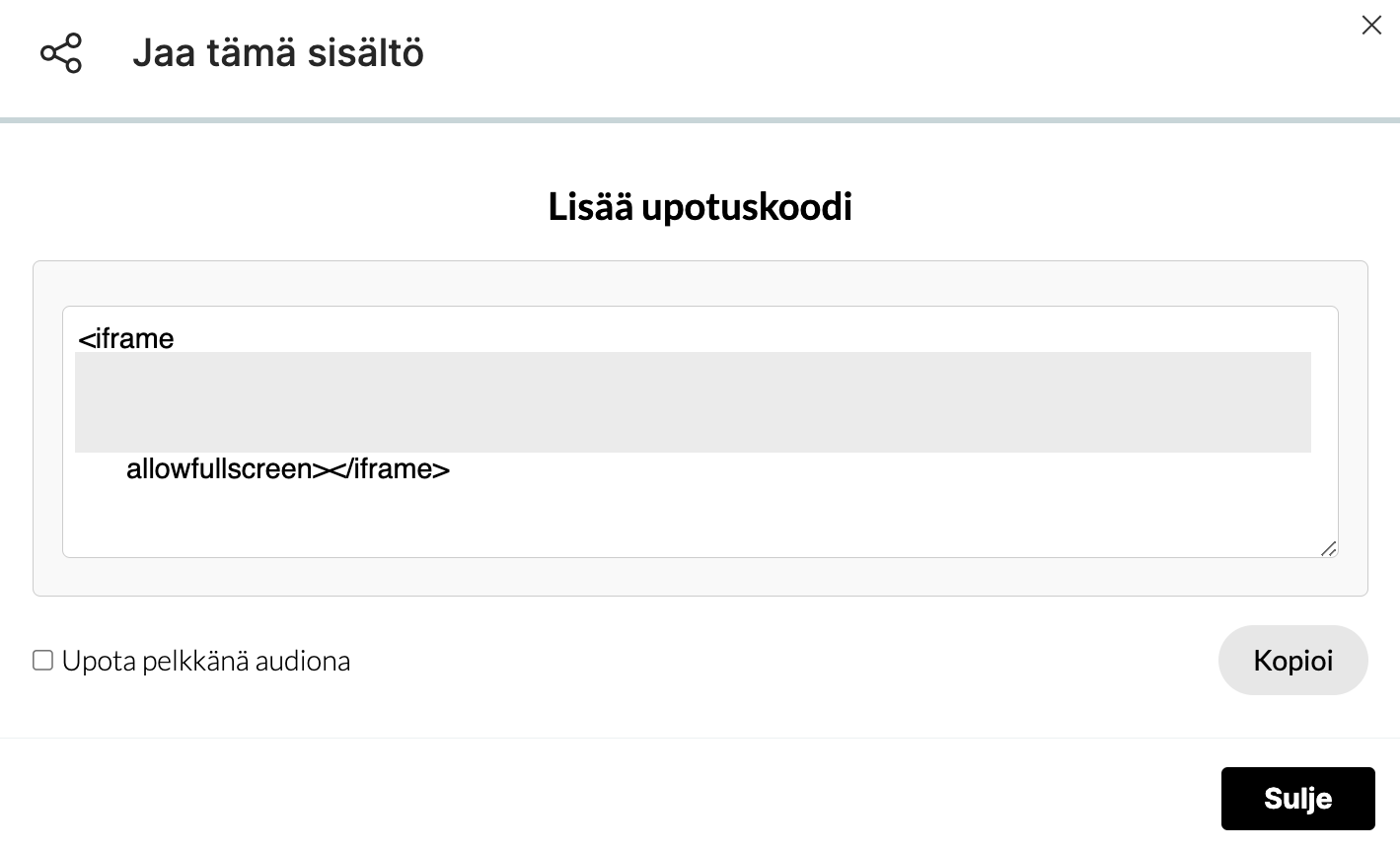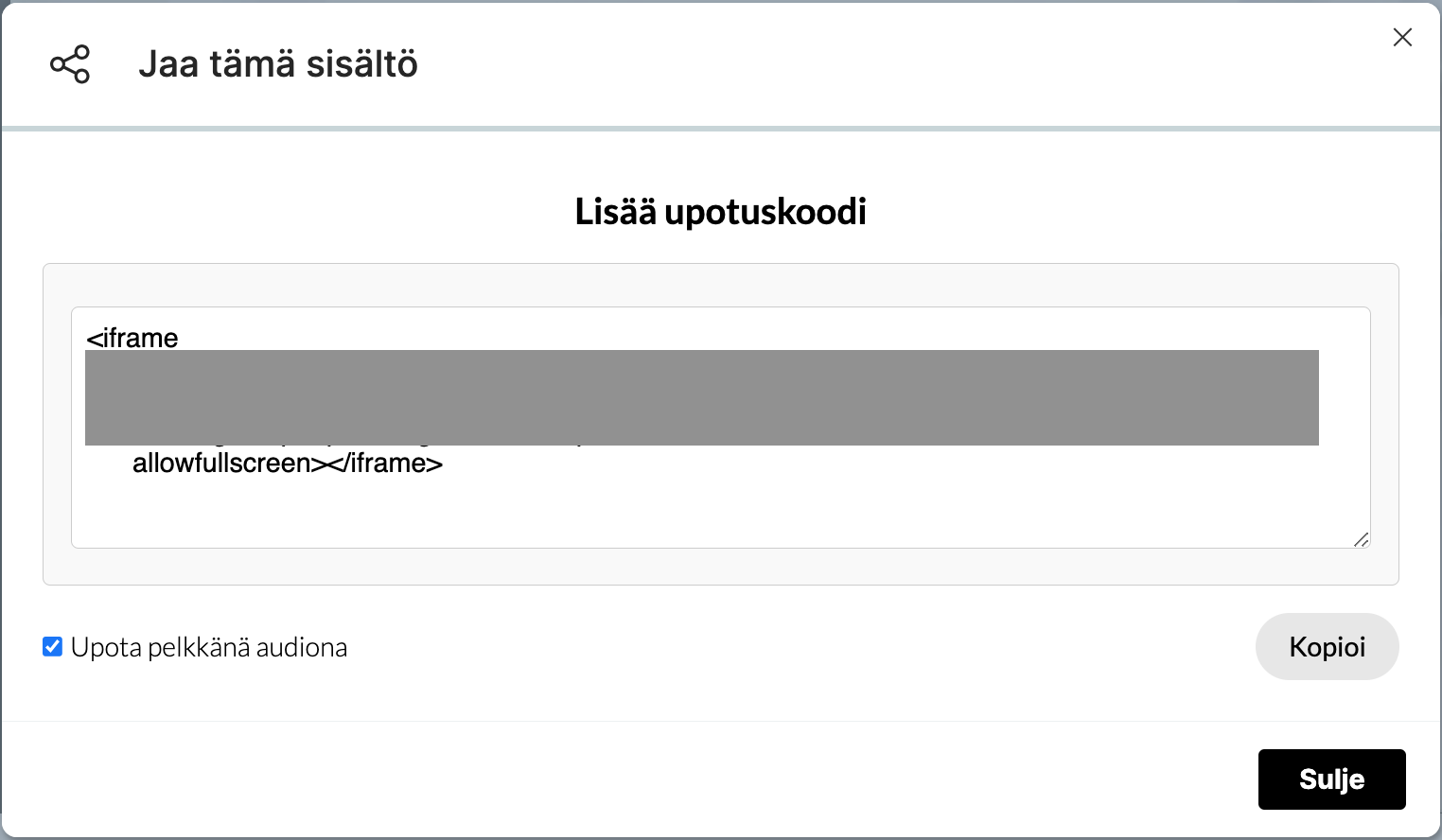 - Rastita "Upota pelkkänä audiona". Kopioi koodi klikkaamalla kopioi-painiketta ja liitä se Moodleen