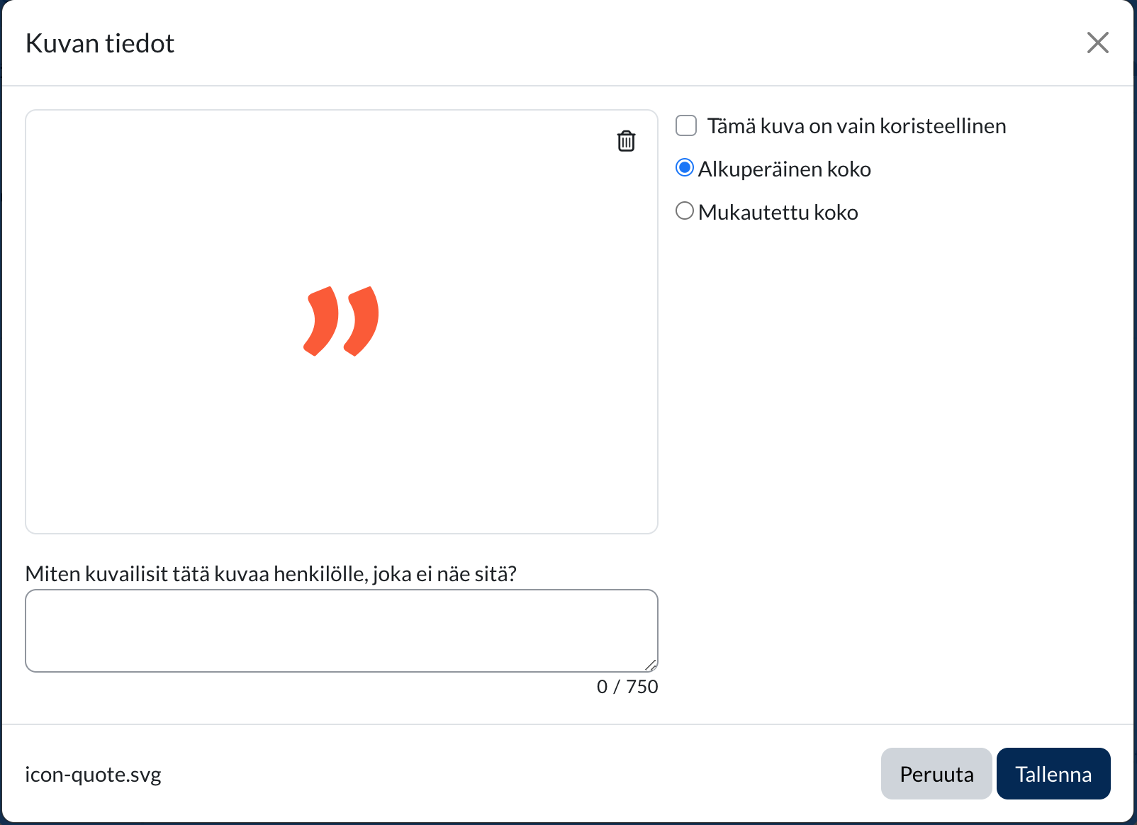 - Kirjoita kuvalle kuvausteksti (alt-text). Kuvausteksti kuvailee kuvan sisältöä esimerkiksi näkörajoitteiselle henkilölle ruudunlukijan avulla. Jos on kyse kuvituskuvasta, rastita "Tämä kuva on vain koristeellinen"-kohta. Tallenna.