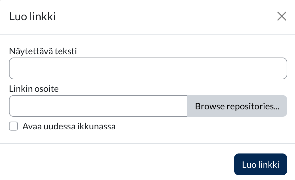 Video- tai audiotiedostostoja ei saa ladata koskaan suoraan Moodleen. Ne tulee ladata asianmukaiseen palveluun, esimerkiksi Moniviestimeen, josta linkität tai upotat videotiedoston Moodleen.