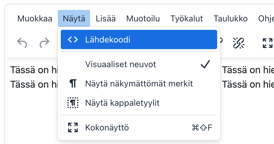- Avaa tekstieditori siitä kohdasta, johon haluat saada videoupotuksen. Klikkaa Näytä-välilehteä ja valitse <>Lähdekoodi
