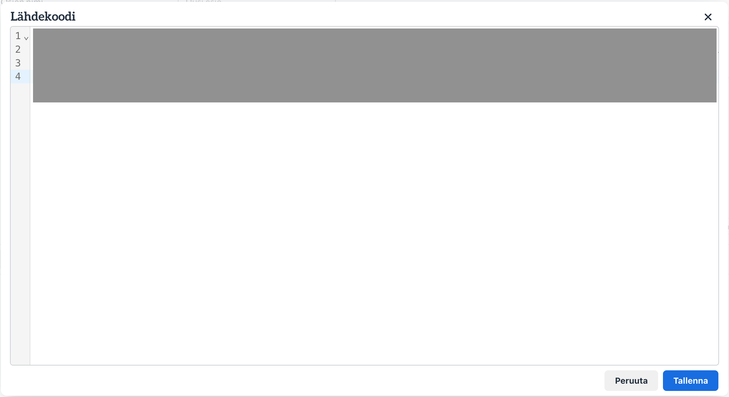 - Liitä tässä näkymässä HTML-editoriin koko upotuskoodi, joka jälkeen voit palata normaaliin näkymään valitsemalla Tallenna. Tallentamalla vielä sivun muokkauksen näet videon upotettuna sivulle.