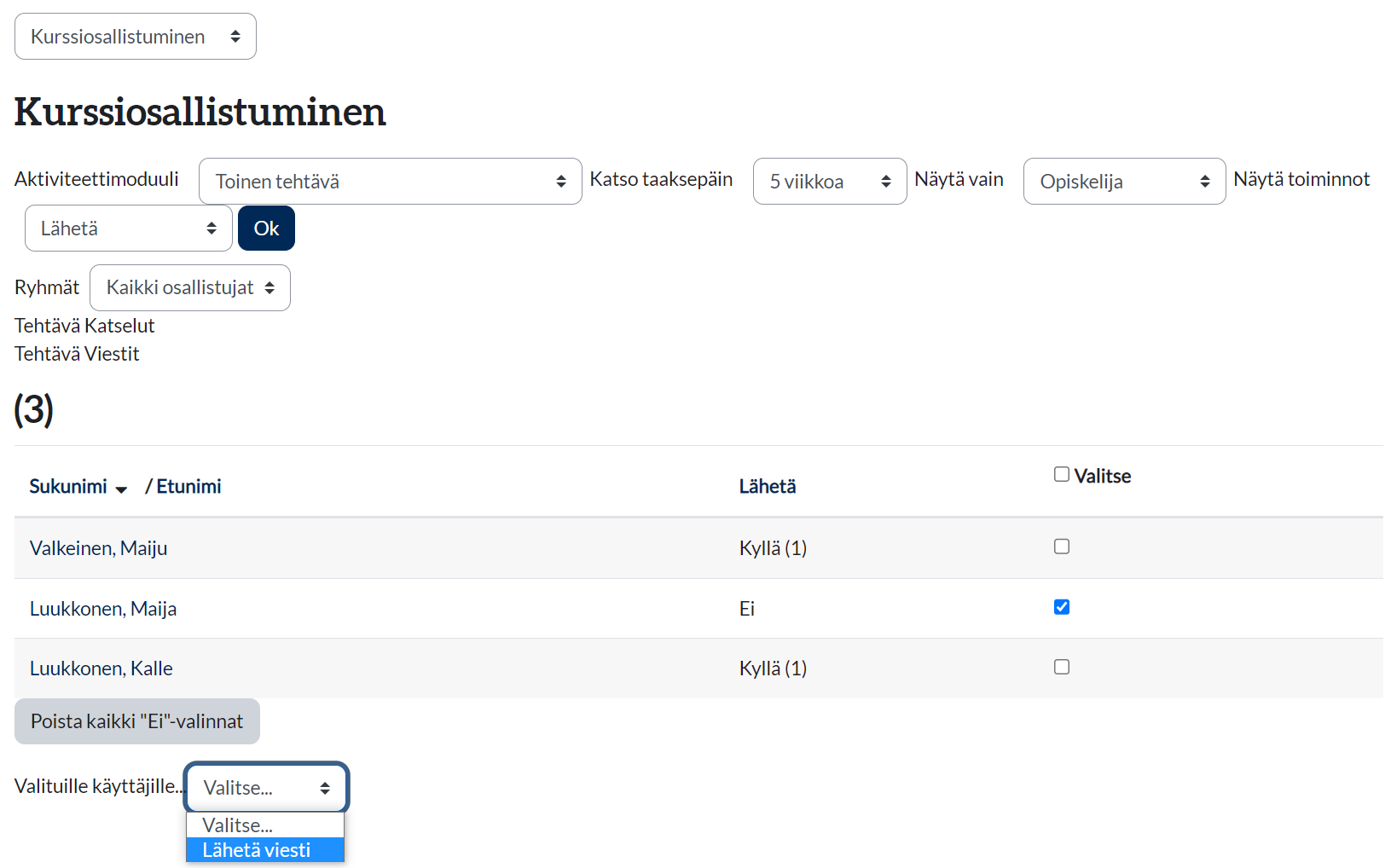 - Kurssiosallistuminen: voit esimerkiksi valita tietyn tehtävän ja ketkä ovat sen suorittaneet sekä lähettää ei-suorittaneille viestiä. Valitse laatikoista haluamasi aktiviteetti, ajanjakso, rooli ja tapahtuma. Lisäksi voit tarkastella tarvittaessa myös ryhmittäin.