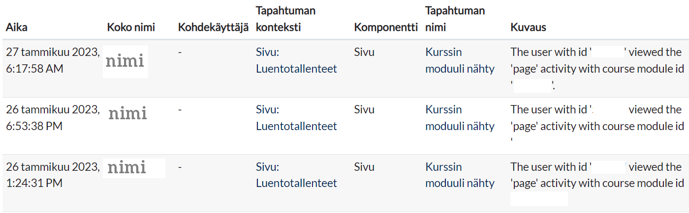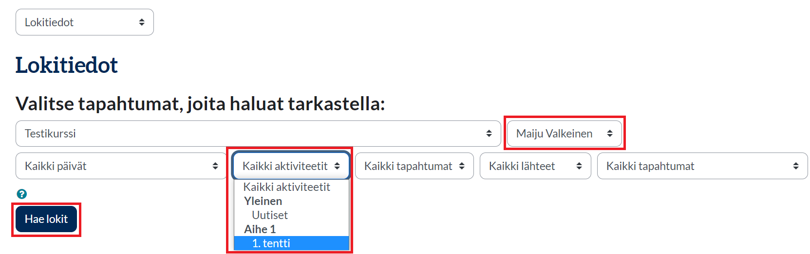 - Lokitiedot: voit tarkistaa, esim. milloin osallistujat avanneet tietyn aktiviteetin. Valitse ensin aktiviteetti Kaikki aktiviteetit -kohdasta ja sitten klikkaa Hae lokit-painiketta