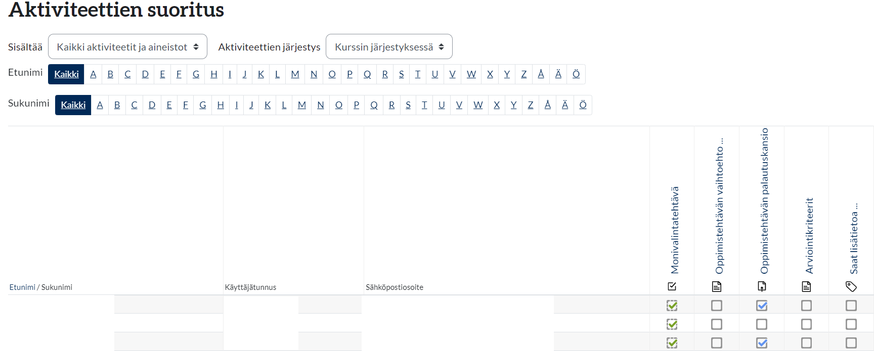 - Aktiviteettien suoritus: jos Suoritusten seuranta on päällä (oletus), saat kaikista opiskelijoista yhteenvedon, mitkä tehtävistä he ovat suorittaneet ja mitkä ovat vielä tekemättä.