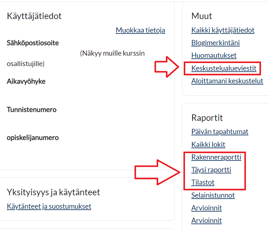 Rakenneraportti: yhteenveto kaikista kurssialueesi aineistoista ja aktiviteeteista, joiden kohdalla on ko. opiskelijan osalta tieto "katsottu x kertaa". Raportissa on myös linkit opiskelijan tekemiin tehtäviin.