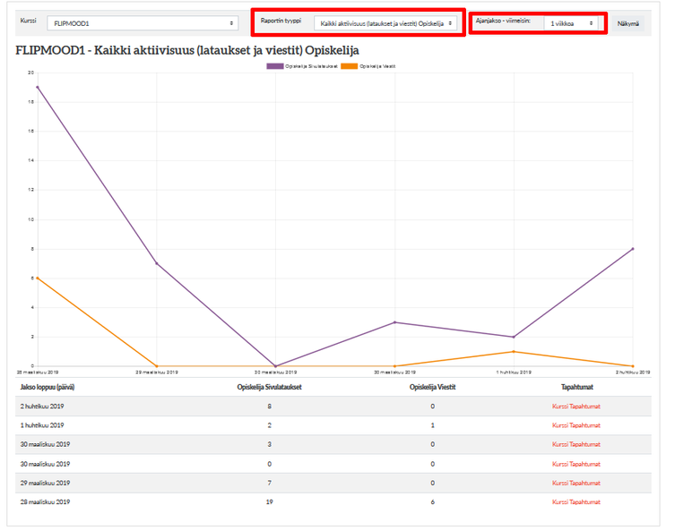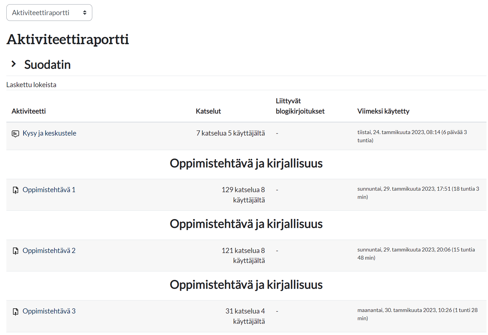 - Aktiviteettiraportti: saat yleiskuvan, minkä verran eri aktiviteetteja on kurssilla käytetty (esim. "4 view by 2 users") ja milloin viimeksi. Voit halutessasi suodattaa tietyn ajanjakson.