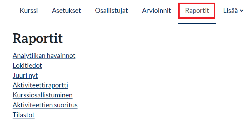 Moodlessa voit tarkastella Raportit -kohdasta koko ryhmää koskevia raportteja. Löydät sen klikkaamalla kurssin pääotsikon alla kohdasta Raportit. Vaihtoehtoisia yhteenvetoja ovat mm. Lokitiedot, Aktiviteettiraportti, Kurssiosallistuminen, Aktiviteettien suoritus ja tilastot.