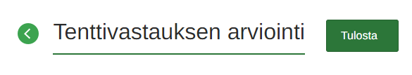 - Voit tulostaa opiskelijan vastauksen Exam-järjestelmästä: klikkaa työpöydältäsi tentin nimeä ja Suoritukset -välilehdeltä löydät Arvioitavana olevat tenttivastaukset. Klikkaa opiskelijan nimeä. Tenttivastauksen arviointi -sivun yläreunasta voit klikata Tulosta -painiketta.
