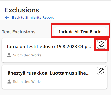 Voit halutessasi palauttaa lähteitä samankaltaisuusraporttiin klikkaamalla auki Exclusions ja palauttaa joko kaikki lähteet kerralla (Include all Text Blocks) tai lähteen kohdalla olevalla kieltoympyrä-kuvakkeella.