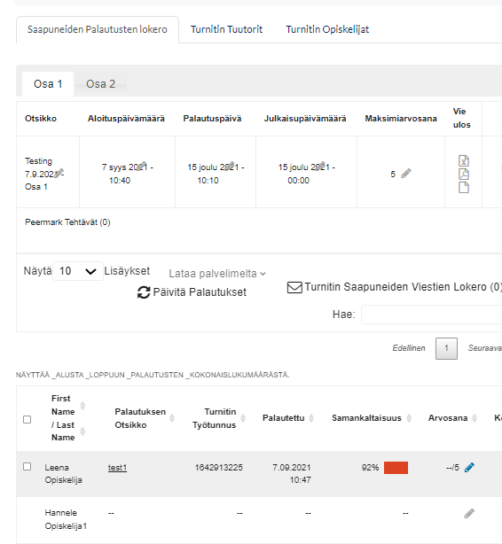Klikkaamalla Palautettu -otsikkosanaa saat yhteenveto-näkymän kärkeen tähän mennessä palautetut työt peräkkäin listana.