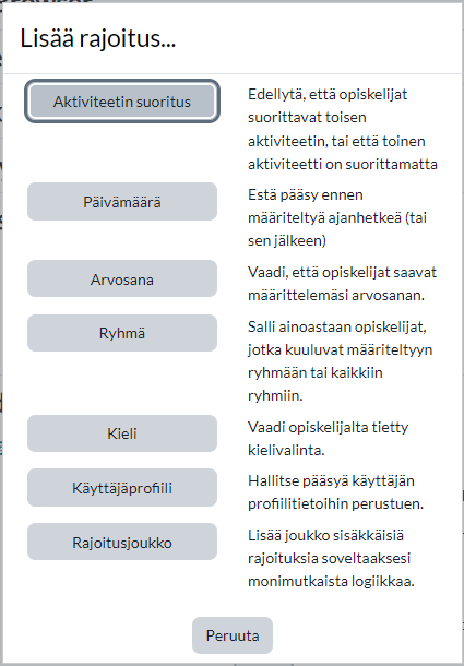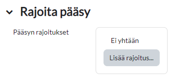 - Rajoita pääsy: Voit asettaa tenttiin pääsyn vain niille, jotka ovat suorittaneet jonkin toisen aktiviteetin ensin, tietyn päivämäärän, arvosanan, ryhmän, käyttäjäprofiiliin perustuen (esim. nimellä) tai luoda useammasta ehdosta koostuvan rajoitusjoukon.