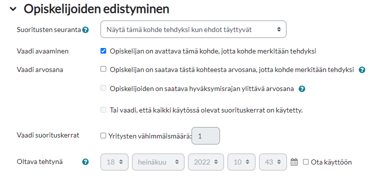 - Opiskelijoiden edistyminen: Voit määritellä kuinka opiskelijoiden edistymistä seurataan tentin osalta.