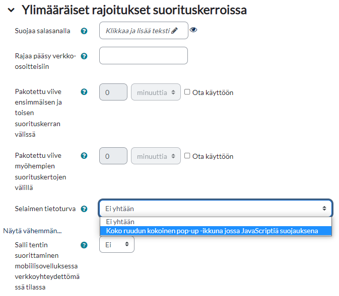 - Ylimääräiset rajoitukset suorituskerroissa: Voit esim. Selaimen tietoturva -asetukseen asettaa Koko ruudun kokoinen pop up-ikkuna..., mikä estää esimerkiksi tekstin kopioimista toisesta lähteestä tenttiin, joten sen lisääminen voi olla aiheellista. Jotta kopointi estyy, sinun tulee lisätä essee kysymyksen omiin asetuksiin Esseen palautustapa kohtaan Vastauksen muodoksi "Pelkkä teksti".