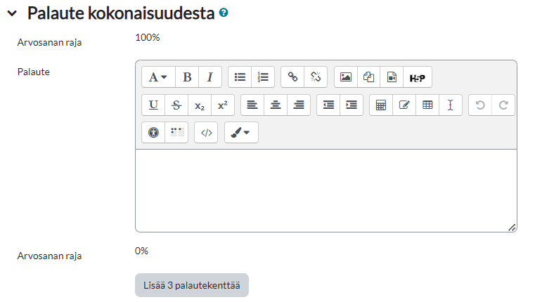 - Lisää 3 palautekenttää -painikkeesta saat lisättyä palautekenttiä ja voit määritellä esim. 75% oikein vastanneille erilaisen palautteen kuin 50% oikein vastanneille.