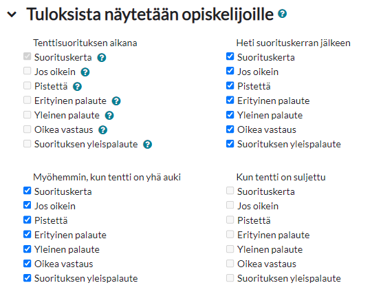 - Tuloksista näytetään opiskelijoille: Näytetäänkö opiskelijoille tenttisuorituksen aikana / tentin jälkeen / myöhemmin / tentin sulkeuduttua jotakin tietoja.