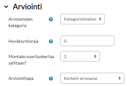 - Arviointi: Montako suorituskertaa opiskelijalle sallitaan ja mikä on arviointitapa (esim. 3 yrityskertaa ja korkein arvosana jää voimaan)?