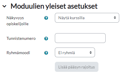 - Moduulien yleiset asetukset: Näytetäänkö tentti opiskelijoille, käytetäänkö ryhmiä.