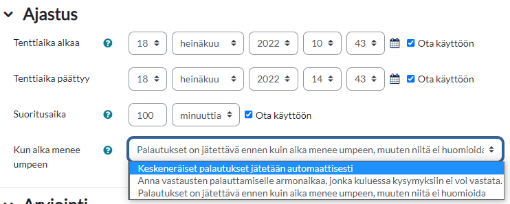 - Ajastus: Milloin tentti on auki ja kuinka kauan? Kun aika menee umpeen -asetuksessa suosittelemme valinnaksi "Keskeneräiset palautukset jätetään automaattisesti".