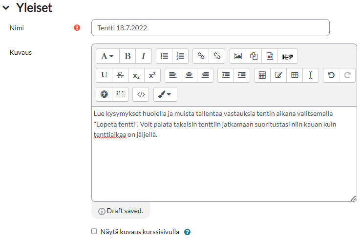 Anna tentille nimi ja halutessasi määrittele yleiset ohjeet tentin suorittamiseen Kuvaus kohtaan.