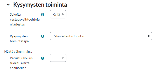 - Kysymysten toiminta: Haluatko, että opiskelija saa palautetta tentin lopuksi vai esimerkiksi jokaisen kysymyksen lopuksi?