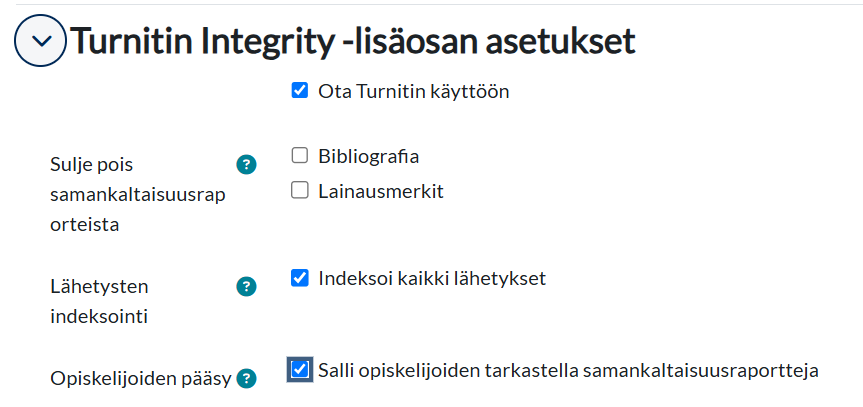 - Turnitin Integrity -lisäosan asetukset: Voit ottaa Turnitin samankaltaisuuden tunnistamisen käyttöön tentin essee kysymyksissä.