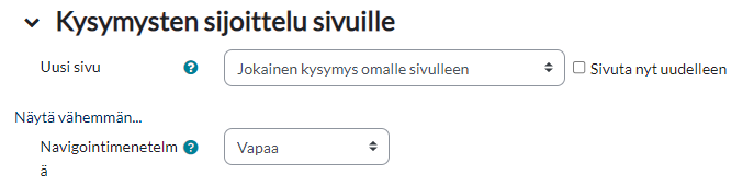 - Kysymysten sijoittelu sivuille: Voit määritellä, kuinka monta kysymystä on per sivu. Suosittelemme, että pilkot isot tentit useammalle eri sivulle, jotta tentin tekeminen on sujuvaa eikä opiskelijan tenttivastaukset häviä koko tentistä, jos esimerkiksi verkkoyhteys katkeaa.