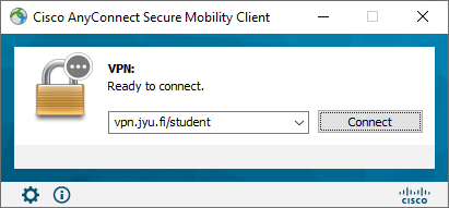 Start the VPN client (Cisco AnyConnect Secure Mobility Client). Type "vpn.jyu.fi" as the address and click "Connect".
