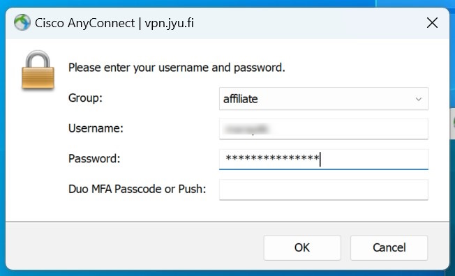 Note! Vpn groups require use of multi-factor authentication with DUO Mobile application. Write word push into second field under Password -field. This field may read "Duo MFA Passcode or Push" or "Second Password". For detailed instructions on how to use Duo Mobile and VPN, click here: Duo Mobile and VPN