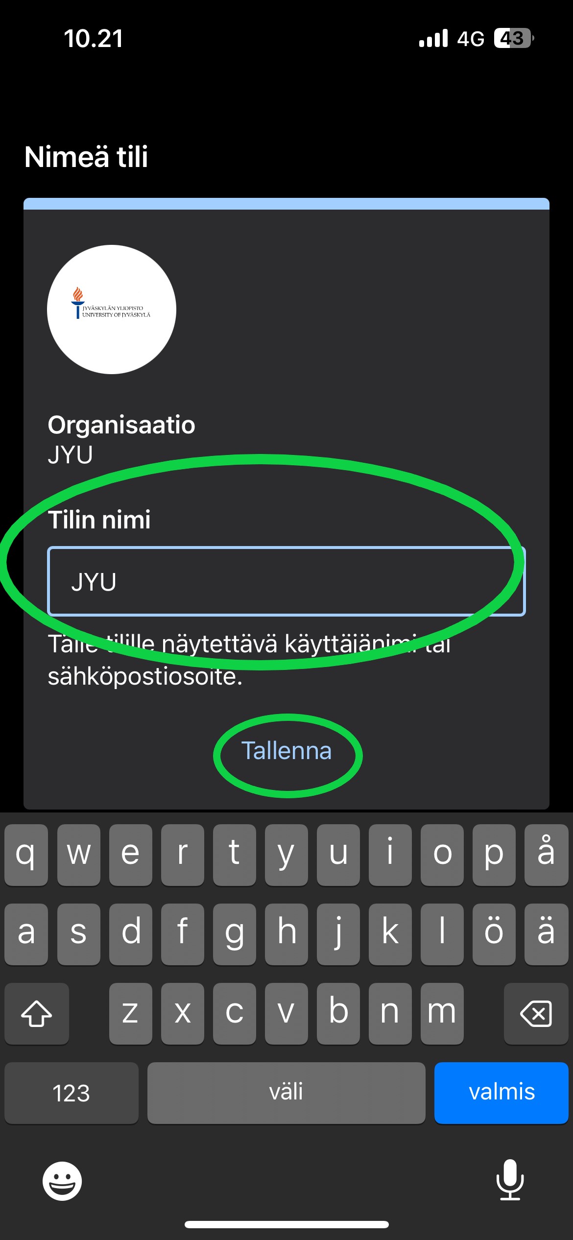 Jatketaan asennusta hetken puhelimella. Voit halutessasi antaa nimen uudelle tilille. Oletus nimi on JYU. Kun olet nimennyt tilisi, paina tämän jälkeen "Tallenna".