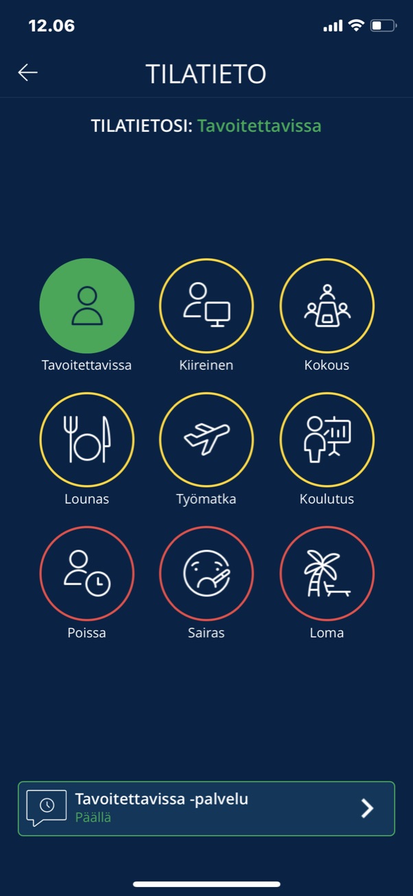 Tilatieto sivulla voi asettaa muille Elisa Ring yhteystiedoissa välittyvän tilatiedon. Esimerkiksi: Poissa, lomalla, lounas, kiireinen, työmatka, etc.
