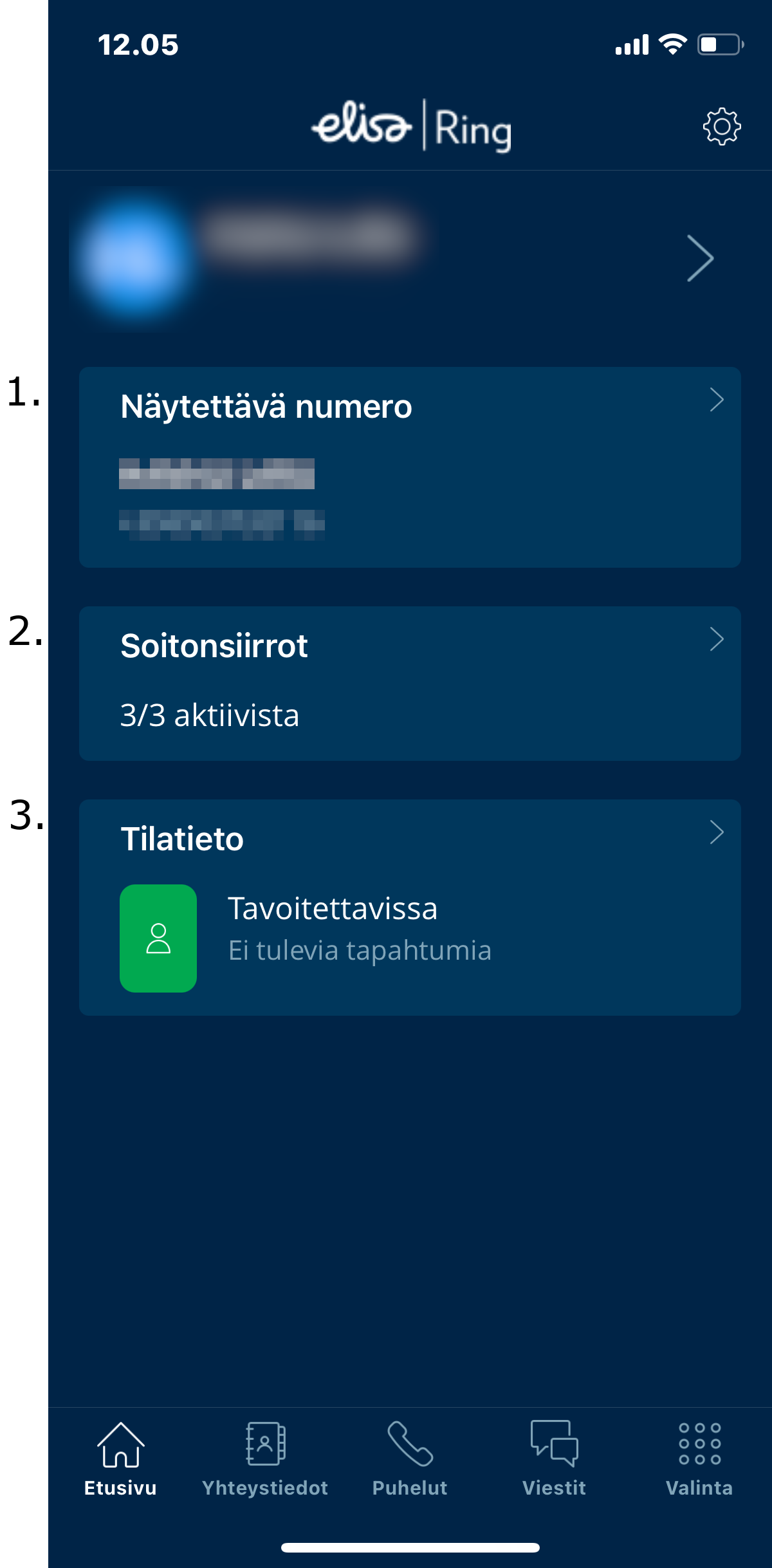 Napauttamalla kutakin otsikkoa sovelluksessa pääset muokkaamaan ko. toimintoa ja alhaalta napauttamalla logoja pääset Elisa Ring yhteystietohin, puhelu historiaan, viesteihin ja lisävalintoihin.