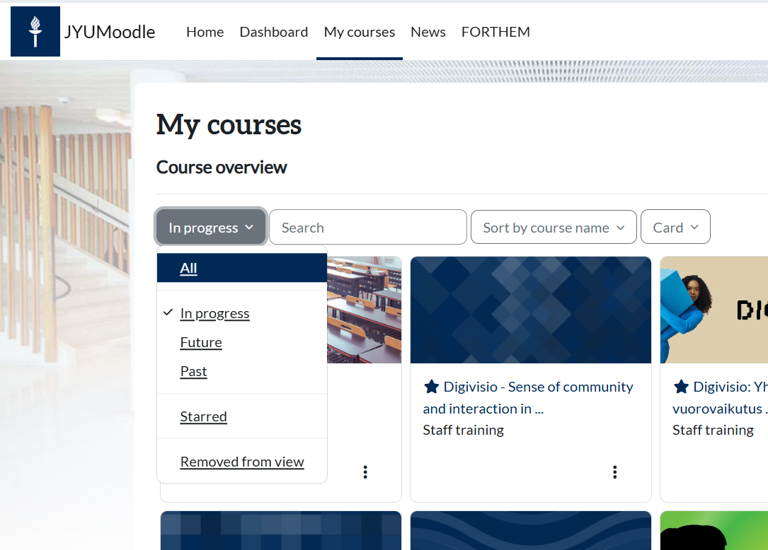 You can filter the view, such as All, In progress, Future, or favorites i.e Starred, by selecting the filter in the top left corner of the in My courses > Course overview.