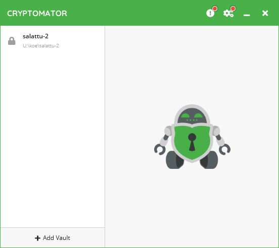 Cryptomatorin omat käyttöohjeet löytyvät sivustolta https://docs.cryptomator.org/en/latest/ . Tässä esitetyt ohjeet on tehty versiolle 1.5.16.