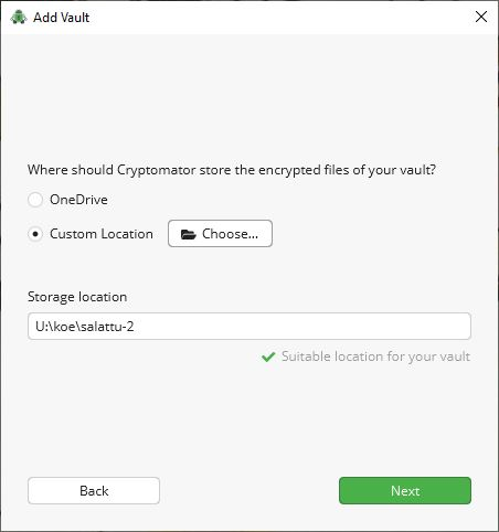 Salatut tallennuspaikat voivat olla suoraan näkyvissä Cryptomator-ohjelmassa tai ne voidaan avata tallennuspaikasta löytyvästä tiedostosta ”masterkey.cryptomator”.