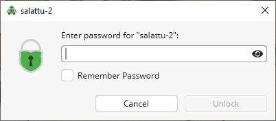 Salasana voidaan myös tallentaa koneelle valitsemalla ”Remember Password”. Silloin Cryptomator tallentaa salasanan koneeseen, jossa ajat Cryptomatoria käyttämällä koneen käyttöjärjestelmän palvelua. Tallennuspaikan salasana salataan käyttäjätunnuksesi salasanalla. Cryptomator avaa tallennuspaikan samalla käyttöjärjestelmän palvelulla.