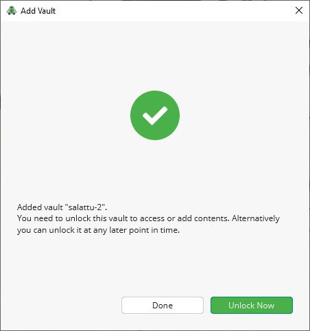 Salattu tallennuspaikka luodaan ”Create Vault” -painikkeella. Cryptomator vahvistaa luodun tallennustilan ja ehdottaa sen avaamista: