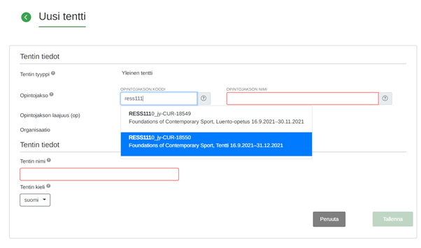 Kun luot uutta tenttiä, se pitää kiinnittää johonkin opintojaksoon. EXAMin ja Sisun välille on rakennettu integraatio, jolla EXAM hakee toteutuksen tiedot Sisusta tentin perustietoihin.