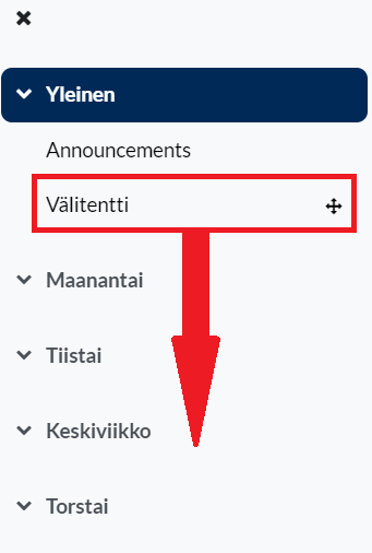 Sisältöhakemisto aukeaa vasempaan reunaan, ja siinä luetellaan kaikki välilehdet ja niiden aktiviteetit. Vie hiiren kursori sen aktiviteetin päälle, jonka haluat siirtää. Tartu joko aktiviteetin nimeen tai sen oikealle puolelle ilmestyvään nuolikuvioon, ja raahaa aktiviteetti haluamaasi välilehteen hakemistossa.