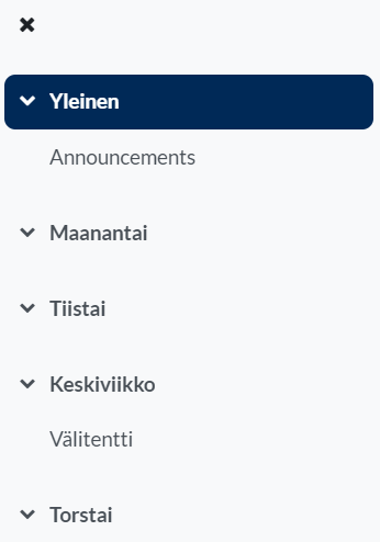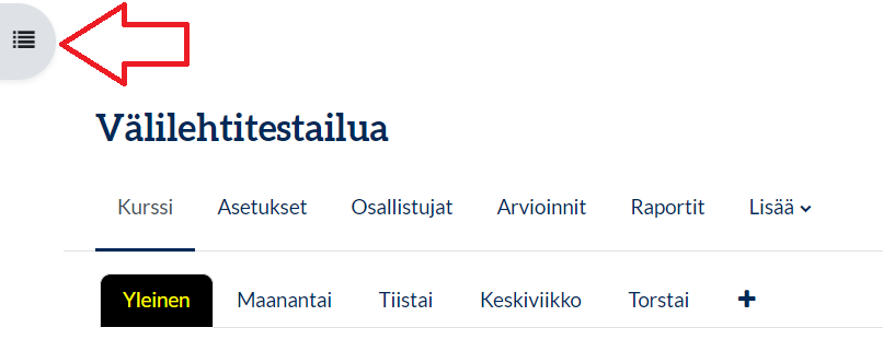 Kurssialueen Muokkaustilan ollessa päällä, klikkaa kurssialueen vasemmassa reunassa olevaa harmaata painiketta, josta avautuu kurssin sisältöhakemisto.