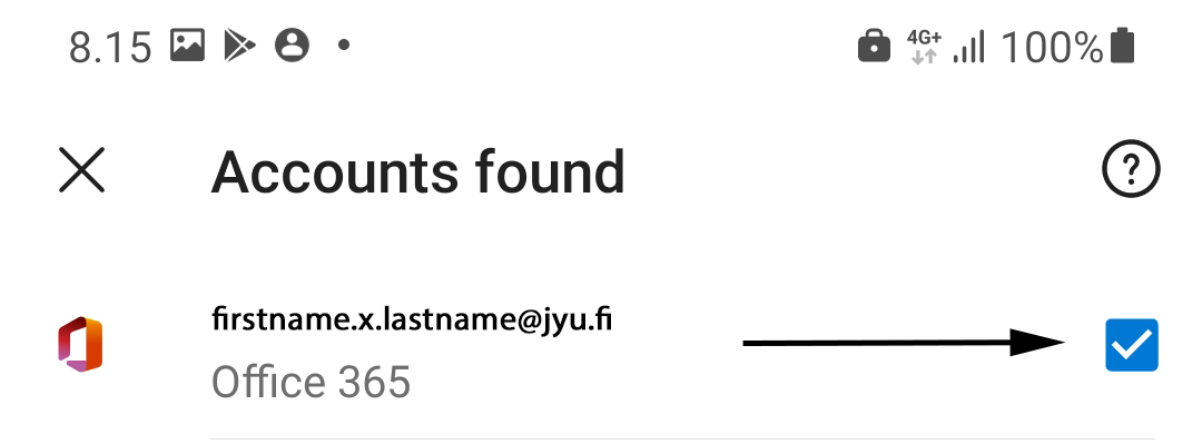 3. Now Outlook will find your existing account at the form firstname.x.lastname@jyu.fi