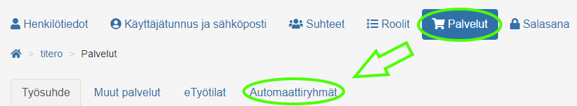 Sähköpostilistan hallinnointiin pääset klikkaamalla OMA-palvelussa Palvelut-painiketta ja valitsemalla Automaattiryhmät. HUOM! Jos sinulla ei näy OMA-palvelussa hallittavia automaattiryhmiä, sinulla ei ole ylläpito-oikeutta mihinkään automaattiryhmään.