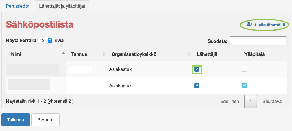 Lähettäjät ja ylläpitäjät -sivulla voi muokata sähköpostilistan lähettäjiä. Jos listan jäsenellä ei ole Lähettäjä-oikeutta, ei hän voi lähettää listalle sähköpostia. Lähettäjiä lisätään klikkaamalla 'Lisää lähettäjiä'- painiketta.